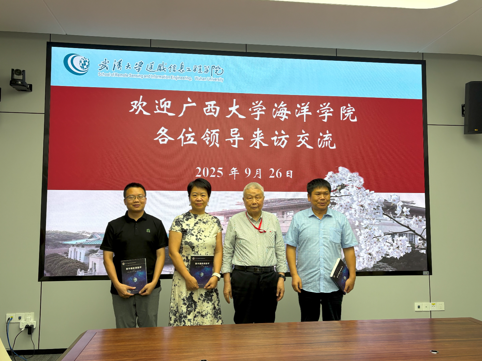 2025年9月27日,广西大学海洋学院院长、广西南海珊瑚礁研究重点实验室主任余克服教授带领我院副院长徐向荣教授、重点实验室常务副主任黄荣永副教授赴武汉大学遥感信息工程学院,围绕广西大学海洋科学广西院士工作站(以下简称“工作站”)建设及校际合作展开深度研讨。此次交流不仅向摄影测量与遥感学家张祖勋院士专题汇报了工作站建设进展,更聚焦工作站未来规划、学科交叉方向,以及遥感技术与海洋科学融合应用、科研项目联合申报、学术资源共享等核心议题,为双方协同发展凝聚共识。。武汉大学遥感信息工程学院院长张永军教授、副院长乐鹏教授,及张祖勋院士及其团队成员李明、陶鹏杰老师共同出席此次会议,为高效对话与精准合作搭建专业平台。