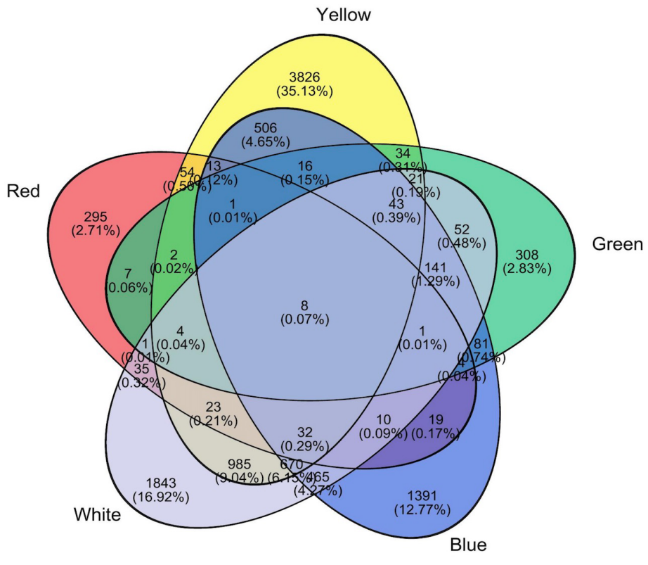 本研究以常见造礁石珊瑚的共生虫黄藻——Cladocopium goreaui为研究对象,系统评估了红、黄、绿、蓝、白五种颜色聚苯乙烯微塑料(粒径5 μm,浓度20 mg/L)对其生长、光合生理、氧化应激及基因表达的影响。研究发现: