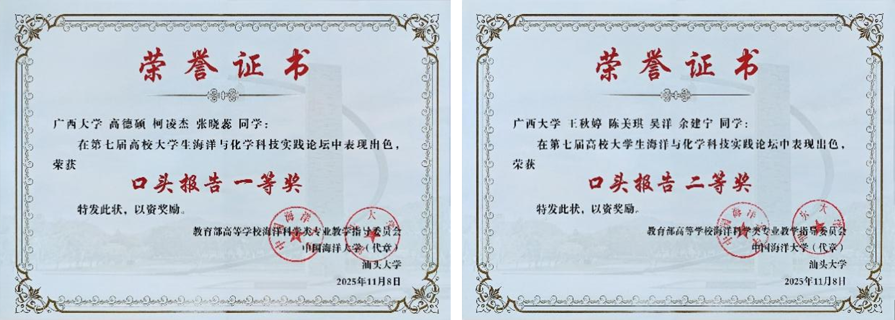 我院学子在本次论坛中表现优异,2023级海洋科学专业本科生高德硕、王秋婷分别代表其团队作口头报告,其研究成果“基于3D打印-SPME牙签喷雾质谱快速检测复杂基质中的有机紫外吸收剂”和“珊瑚砂和珊瑚骨骼中黑碳赋存特点及其碳封存意义”,聚焦海洋环境检测技术创新与珊瑚礁碳循环等前沿领域,分别斩获一等奖、二等奖。2022级海洋科学专业本科生张佳宇的《基于质谱非靶代谢组学研究BP-3对珊瑚的毒理效应》、2024级本科生蔡晓莉的《海上石油污染对发泡聚苯乙烯泡沫和聚乙烯膜塑料中添加剂释放的影响及作用机制研究》,以展板报告形式呈现,围绕海洋生态保护与污染治理关键问题展开深入探究,获得与会专家的关注与认可。