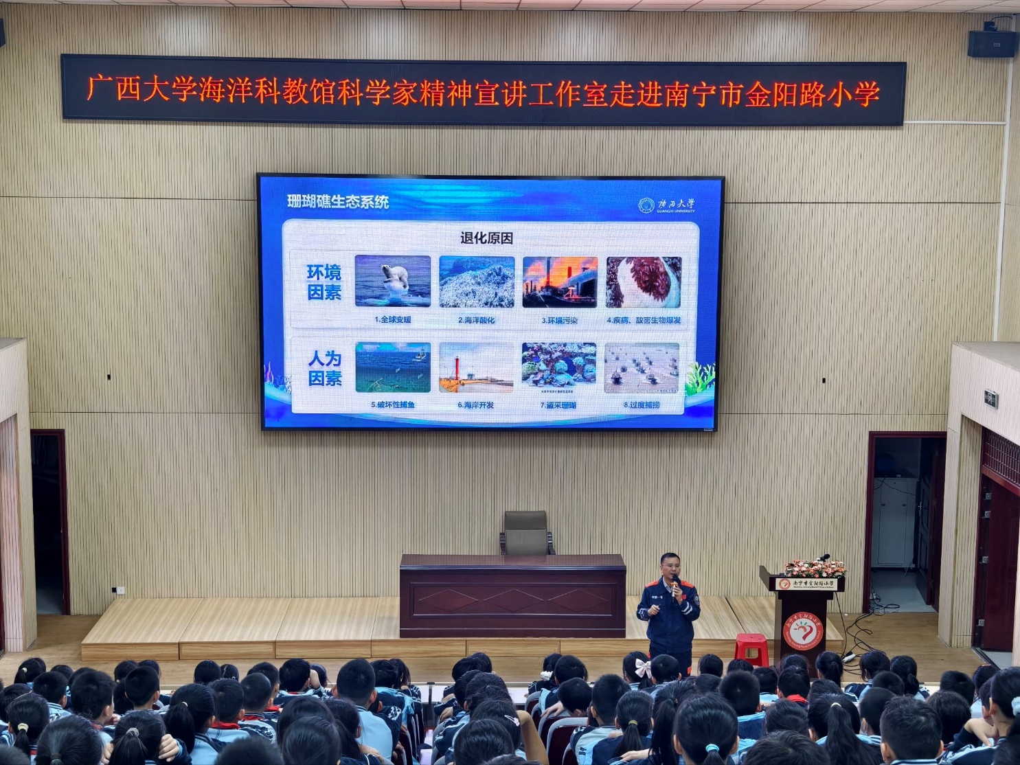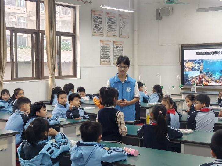 11月27日,广西大学海洋学院“蓝色梦想”科普队携国家自然科学基金科学传播类专项项目,再次走进南宁市金阳路小学,成功举办第六场海洋科普课。本次课程以“科学家精神传递与海洋奥秘探索”为主题,创新采用“双讲堂”并行模式,融信念传递、知识讲解与互动实践于一体,为师生带来一场沉浸式的海洋科普体验,进一步激发青少年的家园情怀与海洋保护意识。