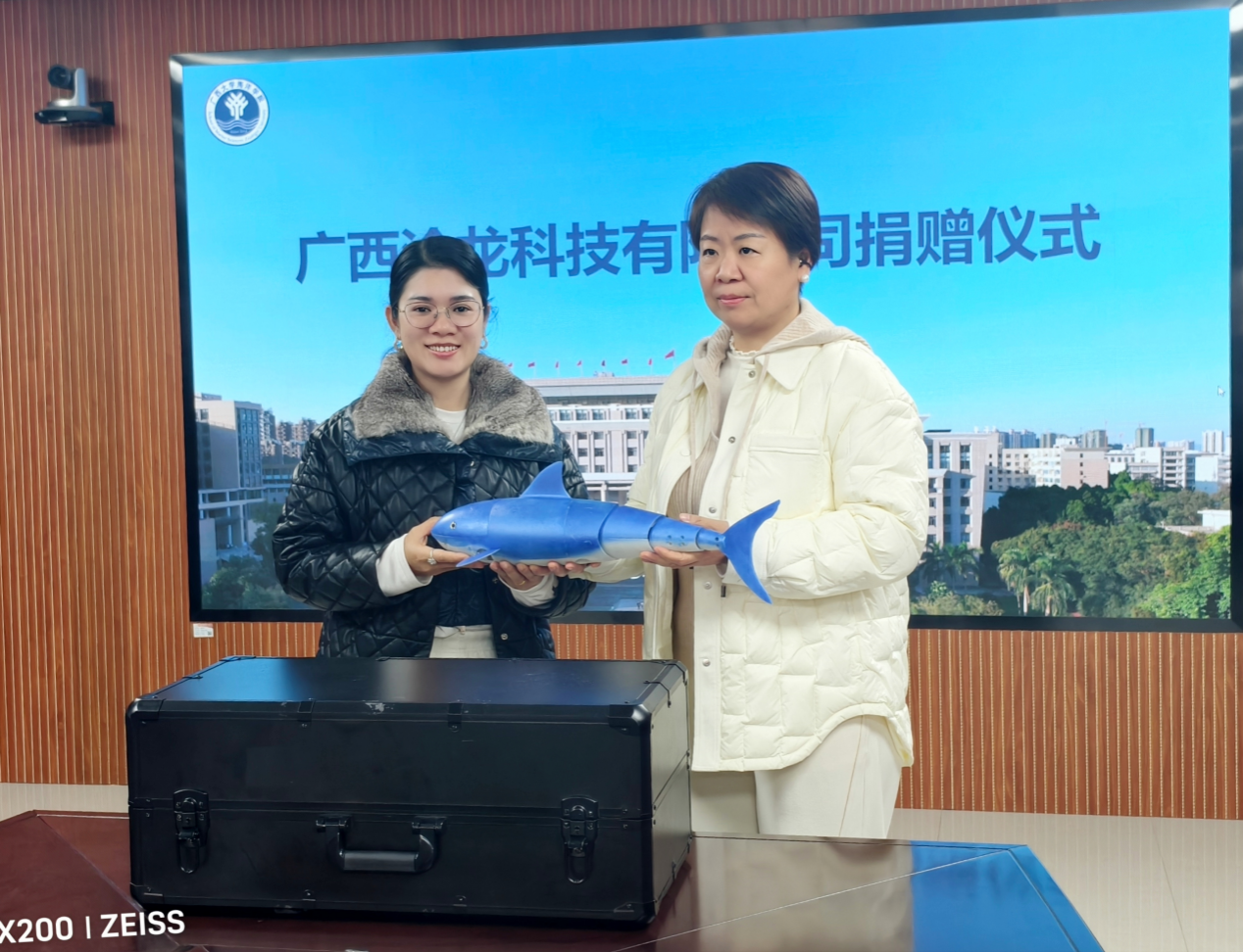 校企同心筑合力,产教融合启新程。12月26日下午,广西沧龙科技有限公司向广西大学海洋学院捐赠仿生机器鱼仪式,在我校综合楼1104会议室隆重举行。此次捐赠旨在深化校企合作内涵,为海洋学科教育科研事业发展注入新动能。广西沧龙科技有限公司市场部总经理黄一峰、市场部副总经理陈艺方,我院副院长徐向荣、海洋科教馆常务副馆长李周佳出席仪式。仪式现场,徐向荣代表学院致欢迎辞,对广西沧龙科技一行的到访表示热烈欢迎,向企业心系教育、助力科研的的善举致以诚挚谢意。她简要介绍了学院在海洋学科建设、人才培养体系搭建、科研创新成果转化等方面的发展成效,并指出,此次捐赠的仿生机器鱼将成为学院科研攻关与教学改革的“硬核助力”,为海洋装备研发、海洋生物模拟能前沿领域研究提供重要硬件支撑。徐向荣表示,期待未来与沧龙科技以此次捐赠为契机,拓展合作维度、深化合作层次,在更多领域实现资源共享、优势互补、共谱校企共赢发展新篇章。