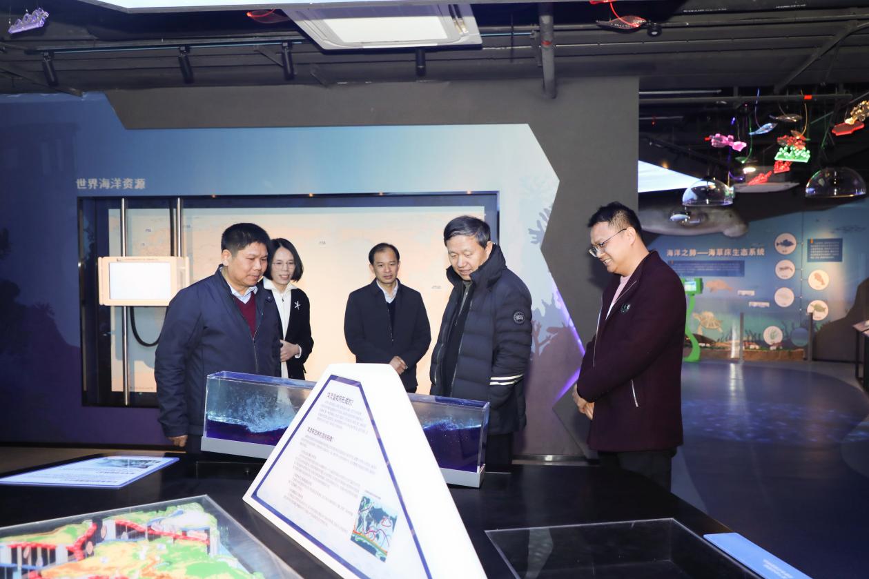 考察期间,李华军院士在学院领导陪同下,先后参观了海洋科教馆与岛礁生态修复实验室。学院副院长刘旗扬向李院士系统汇报了学院以珊瑚礁研究为核心的发展路径、多项海域科考成果,以及在珊瑚人工繁育与生态修复方面的关键技术与进展。李华军院士仔细听取介绍,就科研方向、平台建设与实际应用等话题,与余克服院长等进行了深入交流。