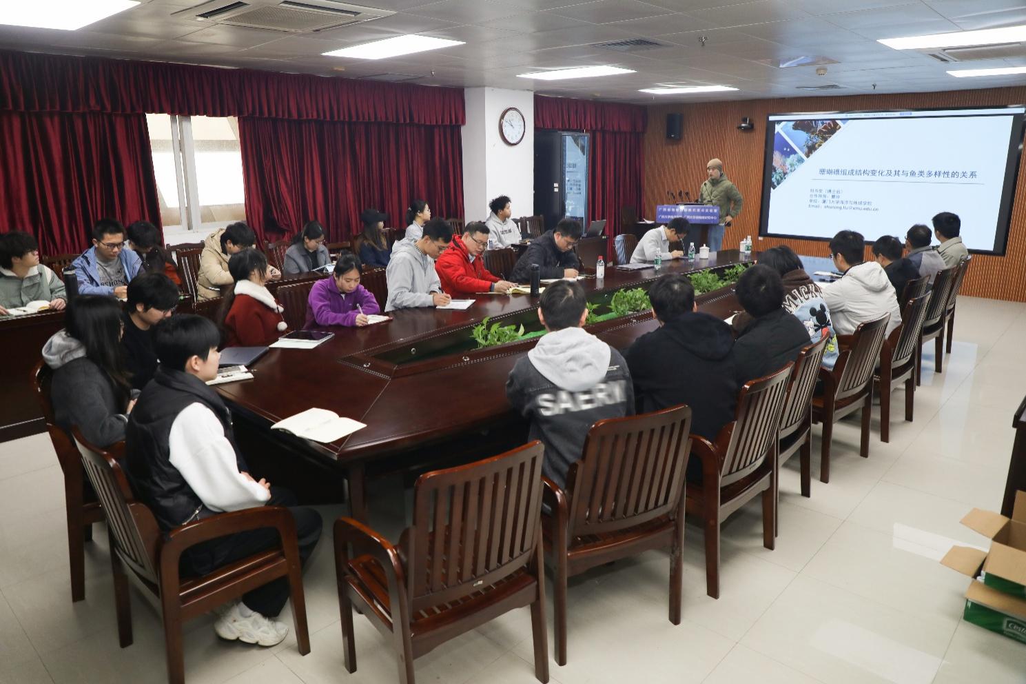1月27日上午,厦门大学海洋与地球学院刘书荣博士后应邀到访广西大学海洋学院,在综合实验大楼1104会议室带来题为《珊瑚礁组成结构变化及其与鱼类多样性的关系》的专题学术报告。报告由学院院长助理俞小鹏主持,师生代表现场聆听学习。