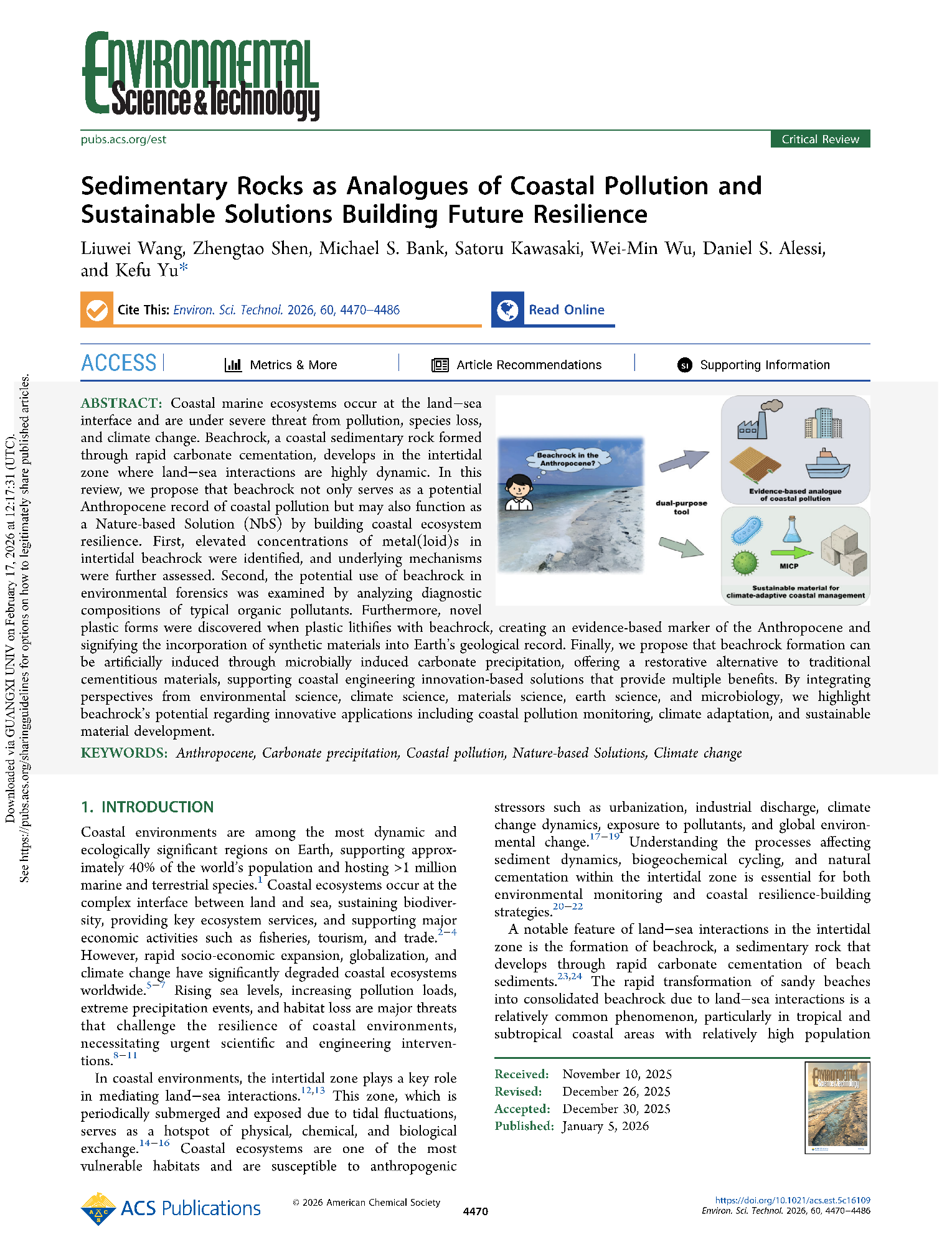 Wang Liuwei, Shen Zhengtao, Michael S. Bank, Satoru Kawasaki, Wu Wei-Min, Daniel S. Alessi, Yu Kefu. Sedimentary Rocks as Analogues of Coastal Pollution and Sustainable Solutions Building Future Resilience. Environmental Science & Technology, 2026, 60: 4470−4486. https://doi.org/10.1021/acs.est.5c16109.