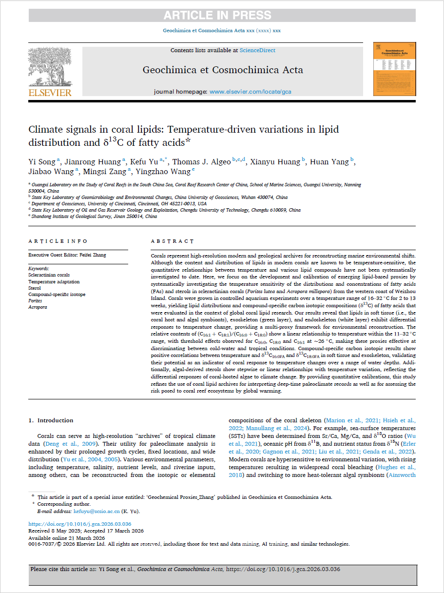 论文信息:Song Yi, Huang Jianrong, Yu Kefu, Thomas J Algeo, Huang Xianyu, Yang Huan, Wang Jiabao, Zang Mingsi, Wang Yingzhao.(2026). Climate signals in coral lipids: Temperature-driven variations in lipid distribution and δ 13C of fatty acids, Geochimica et Cosmochimica Acta, doi: https://doi.org/10.1016/j.gca.2026.03.036