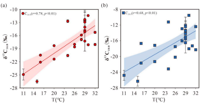 图3 珊瑚脂肪酸单体碳同位素在11–32℃宽温域与温度呈显著正相关