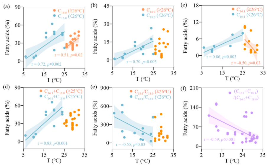 图2 珊瑚脂肪酸相对含量(%)与温度的线性拟合关系