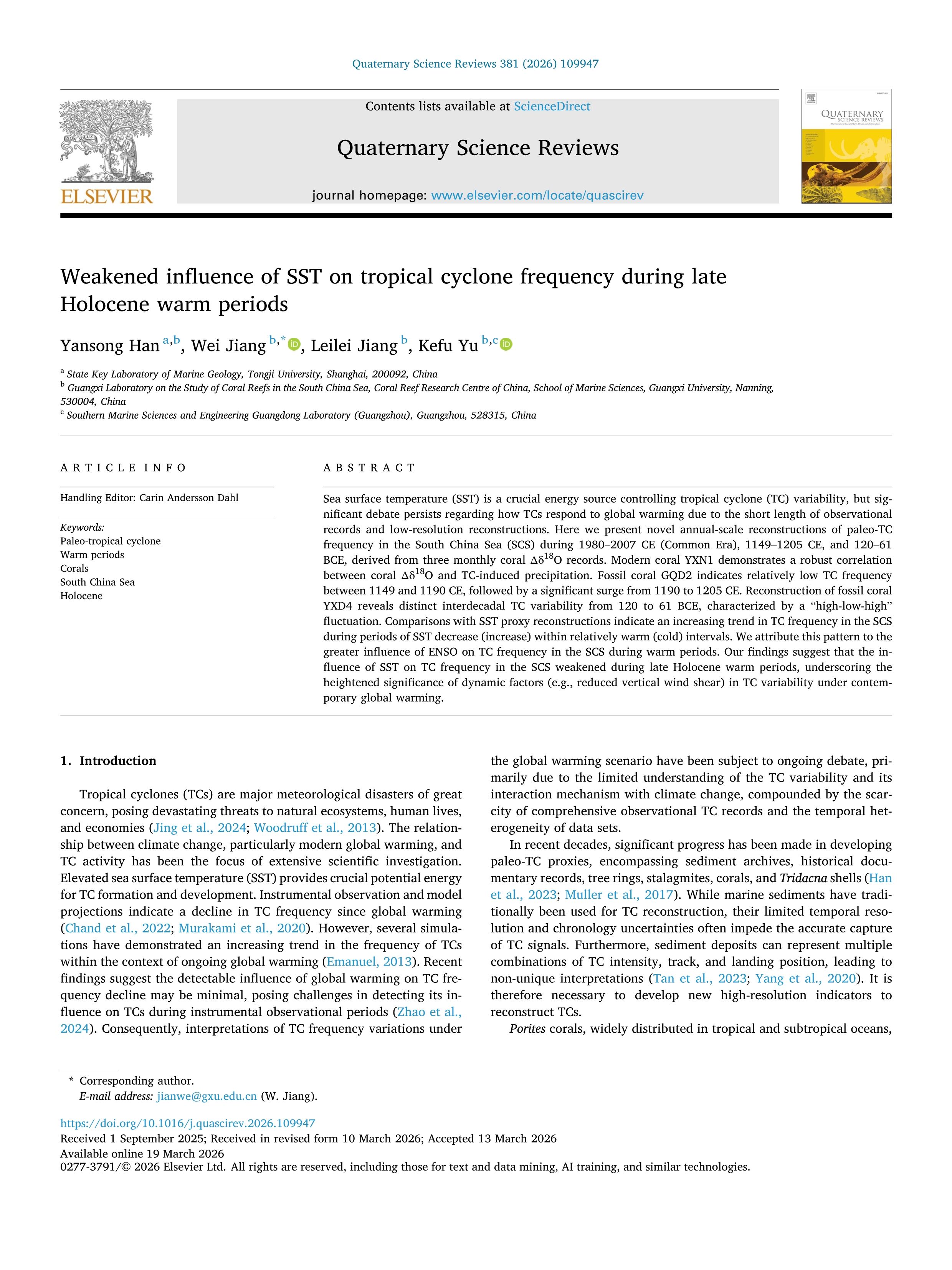 Han, Y., Jiang, W., Jiang, L., Yu, K., 2026. Weakened influence of SST on tropical cyclone frequency during late Holocene warm periods. Quaternary Science Reviews 381, 109947. https://doi.org/10.1016/j.quascirev.2026.109947